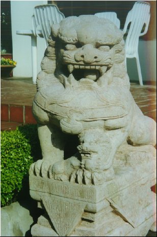 A propos de félin, faut que je vous dise : je suis fou des lions ! Je parle des lions chinois bien sûr, ceux qui gardent jalousement l’entrée des temples, des palais, des anciennes demeures et … des banques ! Vous voyez, hein : quand je vous parlais d’assimilation ! Vous en avez beaucoup, vous, des collègues ou des amis chinois qui ont placé une paire de lions devant leur porte ? Et bien, nous, oui ! Et attention, hein, pas n’importe quels lions. Du beau, du massif : pas de la guimauve. En granit rose qu’ils sont. Oui Madame!