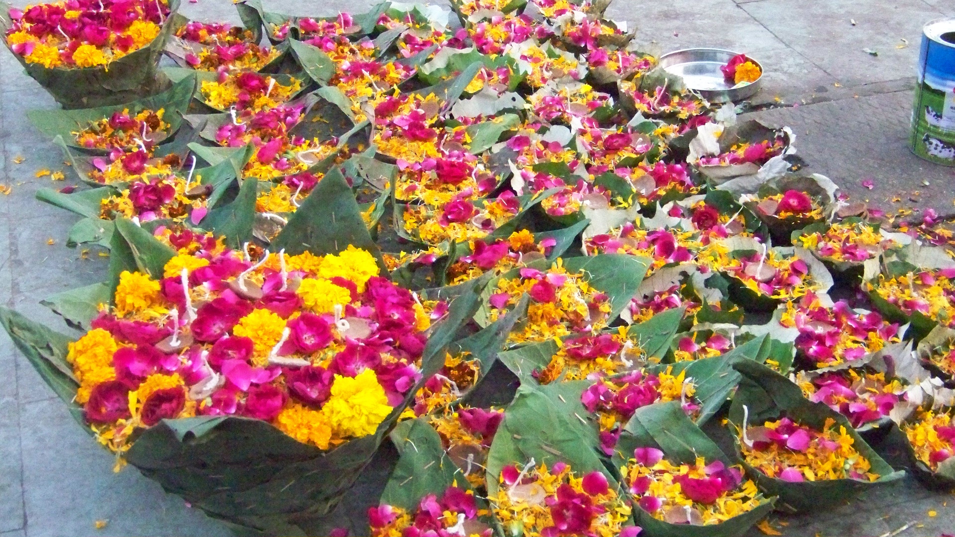 Mais sur le chemin qui nous menait au ghât, nous avions à nouveau été l’objet de toutes les attentions. Des dizaines de petits vendeurs nous proposaient leurs objets rituels : petites urnes de sindur, cette poudre végétale utilisée pour tracer le Tilak rouge sur le front des croyants, fioles d’eau sacrée du Gange, images pieuses, diyas (petits paniers offrandes constitués de feuilles et de fleurs et portant en leur centre une minuscule lampe à huile), bracelets de bronze, bangles, bijoux, etc…