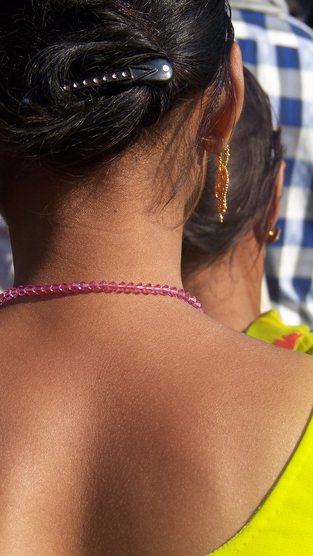 En maugréant, nous avions donc repris la traversée, et c’était là que je l’avais aperçue. Elle avançait devant moi, la démarche altière, enrubannée dans un sari largement décolleté dans le dos, et dont le jaune vif tranchait sur sa peau dorée. Elle avait relevé ses cheveux de jais en chignon, découvrant sa nuque parfaite et ses oreilles délicatement ourlées, finement décorées d’une boucle en or. Je joins la photo pour que vous puissiez en profiter vous aussi. J’étais en équilibre instable sur un pont suspendu au-dessus du Gange et devant moi, c’était tout le charme de Lakshmi et de Parvati qui étaient réunis. En fait, j’étais au nirvana ! Je ne la voyais que de dos, mais cela n’avait pas d’importance. Cela me suffisait amplement. En achevant la traversée du pont, je m’étais posé la question de savoir lequel de cette créature de rêve ou du Taj Mahal était le plus parfait. Indécis, j’avais décidé de reporter le problème à plus tard, la question était d’importance et il ne fallait rien précipiter.