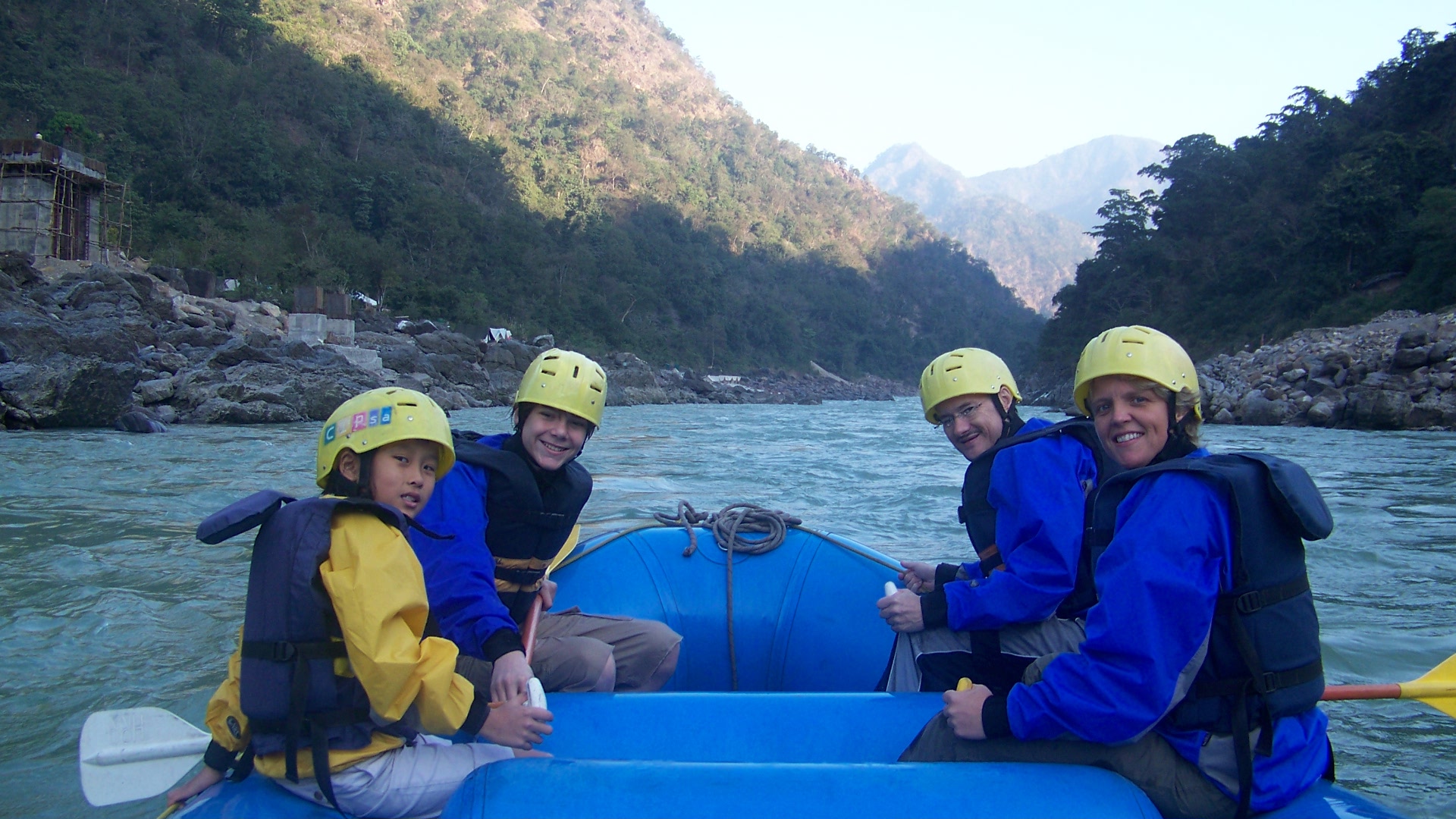 Si le Camp King elephant était déserté, il n’en allait pas de même pour « l’Himalayan River Runners Camp ». Au contraire, un groupe imposant de familles de l’école américaine de Delhi y avaient élu domicile pour y passer les fêtes de Thanksgiving. Face à ce groupe d’amis très proches, et malgré leur convivialité toute américaine, nous nous étions rapidement sentis un peu exclus, et nous avions finalement regretté la tranquille quiétude de Camp King Elephant… Pourtant, le camping sur les berges du fleuve était joli. Sous le soleil chaud de l’après-midi, les tentes vertes tranchaient sur la blancheur immaculée du sable. Je dois dire que j’étais sidéré par la propreté et la beauté de ces plages. C’était tout à fait inattendu le long du Gange. Mais, nous avions à peine eu le temps de savourer l’endroit que déjà notre moniteur de rafting venait frapper à la porte de notre tente. Enfin, c’est une façon de parler…