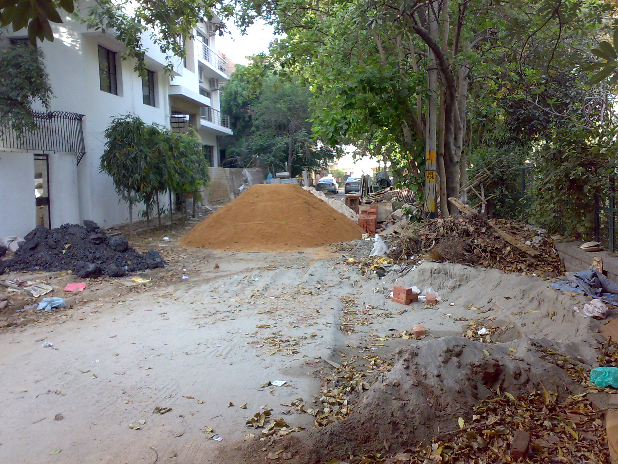 Le soir en rentrant du boulot, le tas avait été déplacé, mais à peine, juste assez pour nous permettre de rentrer la voiture dans l’allée.  Et encore il fallait faire des manœuvres compliquées. C’était vraiment trop. J’avais eu une mauvaise journée et j’étais en pétard. J’en avais ma claque de voir cette crasse qui me déprimait à chaque fois que je rentrais chez nous. J’avais décidé de passer à l’action. J’avais rameuté le proprio de notre appartement et le responsable du comité de quartier d’Anand Lok, un dénommé Mukul, avocat de son état, figurez-vous (Cela tombait bien, non ?), et les avais enjoints au téléphone, avec confirmation par email, d’agir sur le champ afin de mettre un terme, une fois pour toutes, à cette situation inique. Et cela avait chauffé. Les flics avaient débarqué chez nous dès le lendemain soir, très polis et propres sur eux, et ils m’avaient prié de rédiger une plainte en bonne et due forme, ce que j’ai fait séance tenante, et ils l’avaient emportée illico. Mon proprio avait apparemment tiré sur quelques cordes (j’aime bien cette expression anglaise « to pull a few strings » mais cela ne sonne pas très bien en français !), bref il avait fait jouer ses relations. Il avait appelé directement  le responsable de la police du district ainsi que le Directeur des travaux du MCD (Municipal Corporation of Delhi) pour régler le problème. Il faut dire que notre propriétaire est « Directeur Général Additionnel » au Ministère des finances, donc très haut placé … Les directeurs additionnels sont des gens qu’on a placé à de très hautes fonctions administratives, à des postes qu’on a créés spécialement pour eux. D’où le nom « additionnel ». Souvent, ils n’ont d’ailleurs pas de fonctions réelles, ni de responsabilités. Ils ont juste le titre et l’influence qui va de pair. Mais soit, je ferme la parenthèse et j’en reviens à mon histoire. Quant à Monsieur Mukul, le responsable du comité de quartier, il m’avait donné rendez-vous en bas de l’immeuble le lendemain matin et avait, avant même mon arrivée, commencé à enguirlander le contremaitre du chantier. Il hurlait sur lui comme un putois. S’il avait pu, le gars se serait bien caché la tète sous le tas de sable, comme une autruche. Il roulait des yeux effarés et, à tout moment, je pensais qu’il allait se mettre à genou et implorer notre pardon. Mais je ressentais comme un malaise. D’un côté, cela ne me déplaisait pas de voir ce sale type se faire ainsi humilier devant ses ouvriers, lui qui les engueulait du matin au soir. Mais d’une autre côté, je me doutais bien que ce n’était pas lui qu’il fallait invectiver, mais bien la propriétaire. Mais je compris plus tard, qu’en fait, M. Mukul ne voulait surtout pas s’attirer les foudres d’une des propriétaires les plus opulentes du quartier. Ce qu’il avait fait, c’était juste pour me donner le change …  Il fallait engueuler quelqu’un devant moi pour me montrer qu’il avait fait son travail. C’était tout. Bien entendu, l’engueulade n’avait servi à rien, pas plus d’ailleurs que la visite des flics. Sauf pour eux. Car, grâce à moi, ils avaient pu gagner un peu d’argent. En effet, comme je l’appris plus tard, ils s’étaient empressés d’aller trouver la voisine avec ma plainte dactylographiée pour lui montrer combien j’étais mécontent et méchant, et lui prélever, au passage, un petit bakchich pour les « encourager » à laisser tomber l’affaire…