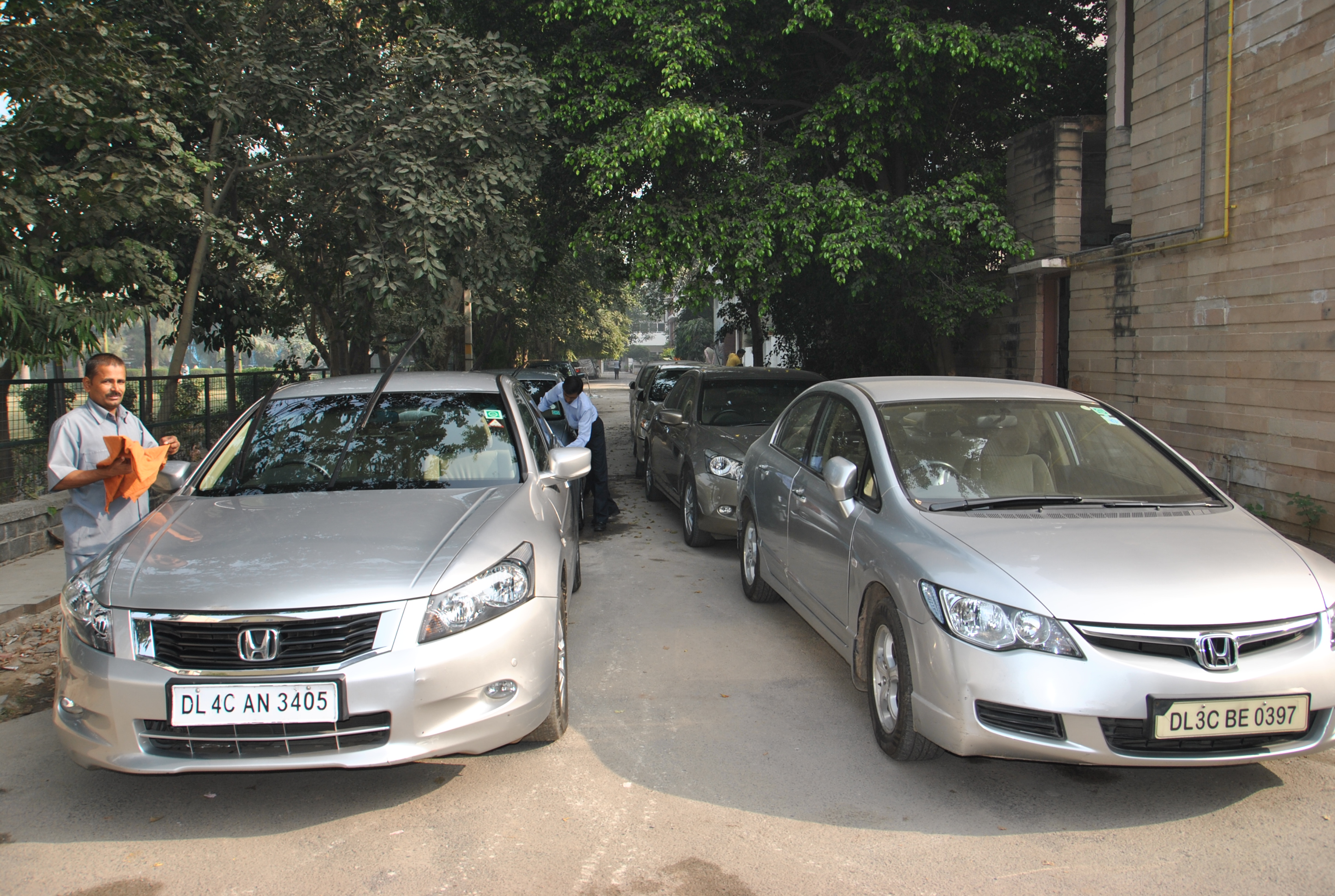 J’avais donc décidé de prendre le taureau par les cornes et aller moi-même à la police. J’avais commencé par prendre des photos des voitures mal garées, avec les plaques bien en vue (NB : J’ai pris la photo ci-dessus au petit matin; comme vous voyez, tous les chauffeurs étaient occupés à astiquer les bagnoles et ils se demandaient bien ce que je faisais, et s’ils devaient poser pour la photo 🙂 ). Ensuite, j’avais rédigé une nouvelle lettre dans mon meilleur anglais, en résumant toute l’histoire depuis le début, et en donnant la liste et la description des 6 véhicules en infraction caractérisée, photos à l’appui, et j’étais parti au poste de police le plus proche. Ma maman était en visite chez nous, à ce moment, et je l’avais emmenée avec moi, car je sais combien les cheveux blancs sont vénérés en Inde (NB : je suis sûr qu’elle ne m’en voudra pas de l’avoir ainsi instrumentalisée à mon profit ! C’était pour la bonne cause !). Et effectivement, au lieu de nous faire poireauter des heures comme c’est souvent le cas chez les flics, on nous avait immédiatement fait assoir dans un petit bureau. Malgré tout, cela s’annonçait mal. Il paraissait que personne ne parlait anglais dans ce poste de police, mais je leur avais fait comprendre qu’on resterait là jusqu’à ce que quelqu’un vienne qui parle anglais et prenne ma plainte. Finalement, une bonne femme épaisse, à triple mentons, bajoues  de morse et carrure de déménageur incorporée s’était pointée. Elle avait l’air aussi aimable que les portes des cachots qu’on avait passées en arrivant. Elle avait pris mon papier entre ses gros doigts, le froissant maladroitement, n’essayant même pas de cacher combien cela la faisait ch… qu’on soit là. Elle avait déchiffré mon texte avec de grandes difficultés, si j’en juge par les gros soupirs de lassitude qu’elle poussait à intervalles réguliers et le temps infini qu’elle avait pris pour en venir à bout. Puis elle avait dit que : « OK, ils  allaient s’en occuper » et nous avait fait un geste de la tête pour nous inciter à lever le camp. Mais j’avais répondu que « non, pas question, qu’il me fallait un FIR – First Investigation report (NB : sorte de PV officiel, sans lequel aucune action légale ne peur être entamée en Inde), que sinon, on ne partait pas ». À contre cœur, elle avait consenti à nous donner un papier avec tous les cachets nécessaires et avait appelé un sous-fifre pour lui expliquer le topo. Surprise, c’était mon gars de l’autre jour, celui qui était venu chez nous prendre ma première plainte et s’était empressé d’aller en soutirer du fric chez la voisine. Et il m’avait assuré avec un grand sourire qu’ils allaient venir tout de suite.